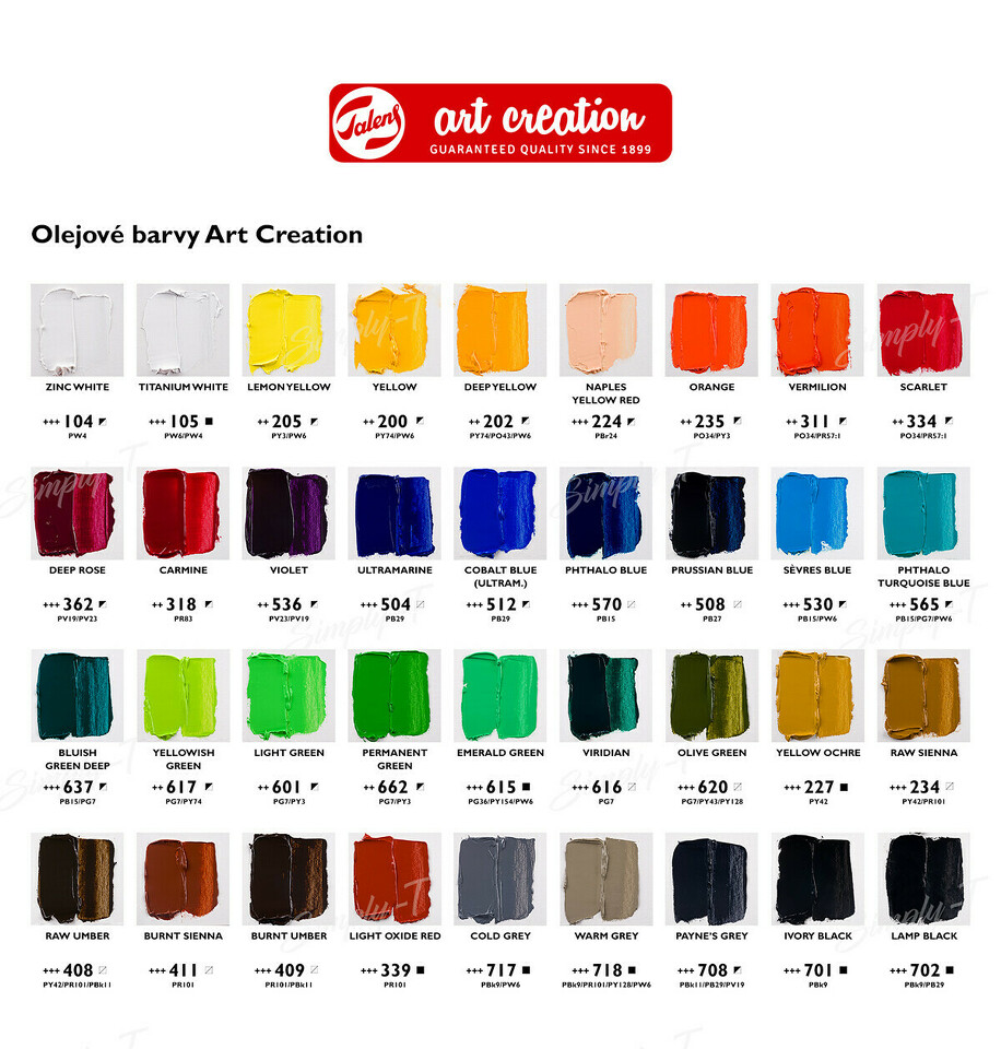 Olejové barvy Talens Art Creation jsou k dispozici v následující škále odstínů: