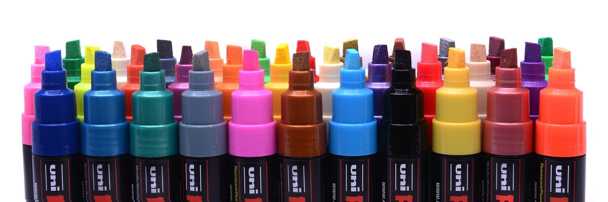 Popisovač POSCA se širokým, seříznutým hrotem. Vhodný pro krytí velkých ploch, stínování nebo
