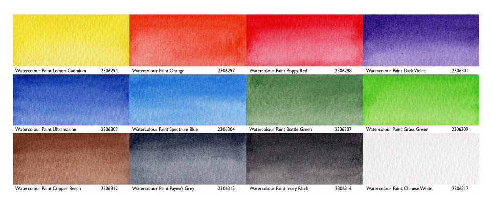 Paleta barev: Lemon Cadmium, Orange, Poppy Red, Dark Violet, Ultramarine, Spectrum Blue, Bottle Green, Grass Green, Copper Beech, Payne’s Grey, Ivory Black, White